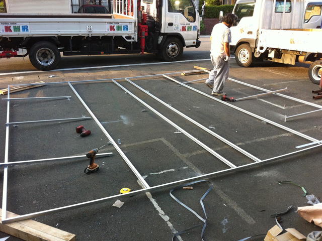 雨が降る中、組立・シート貼り・取付…カッパが邪魔で動きづらい!寒い!