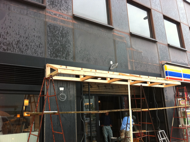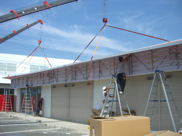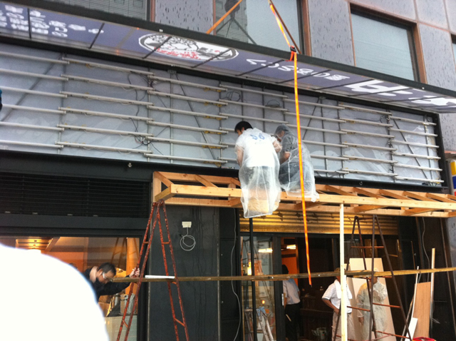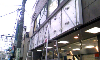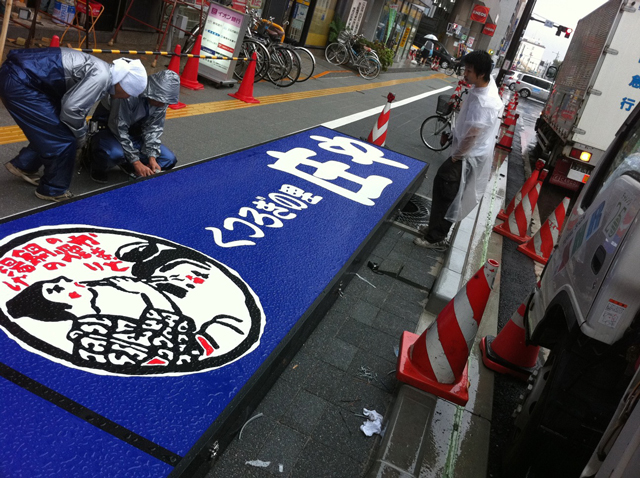 今日は商店街のド真ん中でユニックが使えない…ロープで看板吊って人力だ…